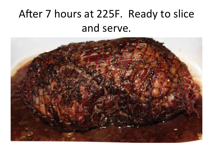 This recipe took 7 hours to roast the lamb at a very low temperature, however, the end result was ever so worth the time and because of the low temperature, the house never got extremely hot. The meat was so tender, full of flavour and delicious. Preparation was very quick and all he had to do is turn the lamb upon each hour and slowly raise the heat.